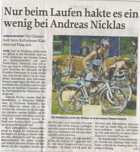 Mit der Zeit von 25.04 Minuten übergab Nicklas den Zeitchip an Bernhard Steinberger, der mit 55.38 Minuten die beste Radzeit aller Staffelteilnehmer erreichte. Als letzter des Trios ging Florian Zimmermann die Laufstrecke bei enormer Hitze an und quälte sich über die Schotterwege. Schon nach 400 Metern übernahm er in seiner Laufgruppe die Führung und erreichte über die elf Kilometer lange Strecke die Laufzeit von 37.28 Minuten. Am Ende hatten die Chamer mit der Gesamtzeit von 1:58:11 Stunden den 2. Platz erreicht.